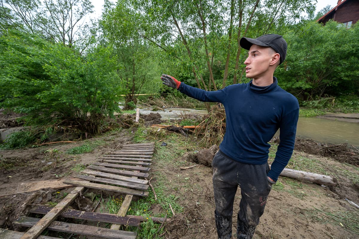 Уздовж будинків подекуди зірване дорожнє полотно, попереду пошкоджений міст. На шляху до нього зустрічаємо місцевого молодого чоловіка, який є власником кафе, розташованого поблизу річки. Юрій Юрків, загрузнувши в болоті, розчищає замулений літній майданчик. Ще кілька днів тому тут можна було смачно поїсти. Навпроти невеликої дороги стоїть його будинок.