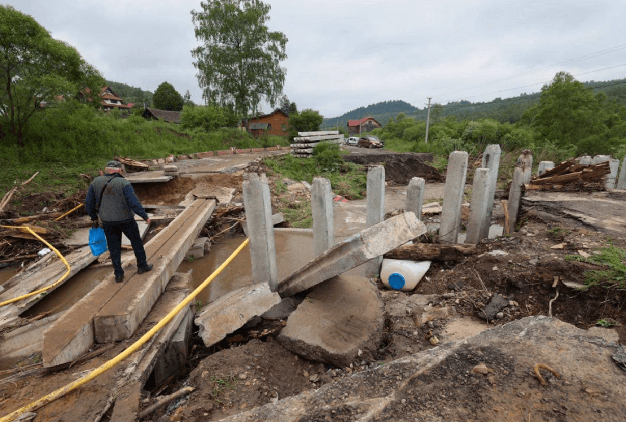 Міст, який туди веде і з’єднує із селом Урич, частково зруйнований, особливо стара частина. Тут уже кілька днів поспіль не вщухає робота, працює техніка, рятувальники, газовики, пересічні мешканці.