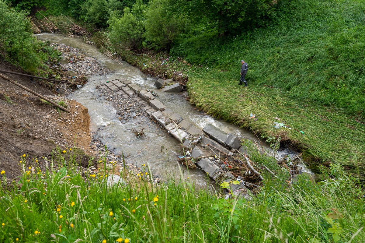 Григорій показує масштаби стихійного лиха і розповідає, що ріка розлилася аж поверх моста. Наслідки можна бачити обабіч нього: від потоку води вилягла трава.