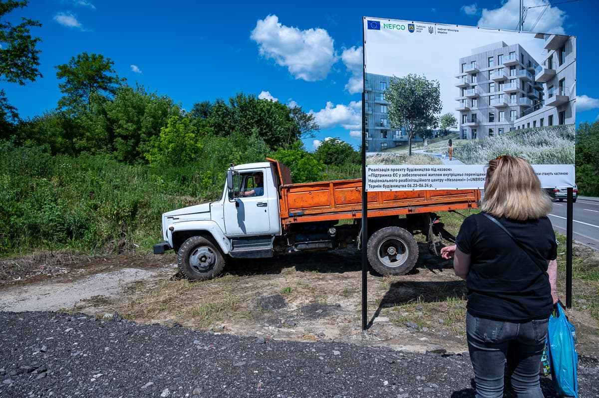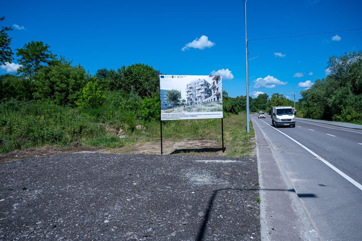 Із таблички при дорозі дізнаємося, що роботи зі зведення житла для внутрішньо переміщених осіб уже розпочалися і триватимуть рік: із червня 2023-го до червня 2024-го.