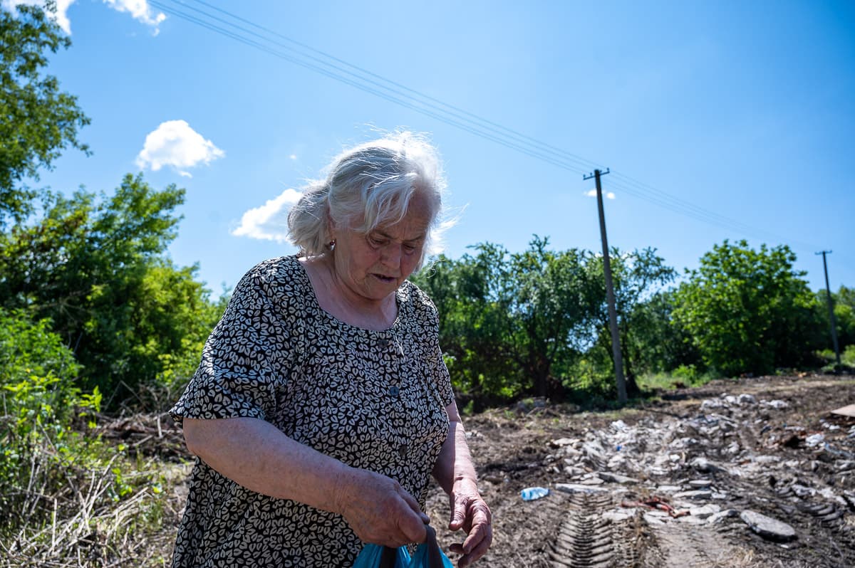 На іншій ділянці помічаємо бабусю Ольгу. Жінці 78 років, близько 20 років вона висаджує тут городину. Живе неподалік, через дорогу, тому «гріх нічого не садити». У целофановій торбинці несе зелену цибулю, якою хоче поділитися з нами, вмовляє узяти жменьку зеленини, бо ж свіжа, нічим не підсипана.