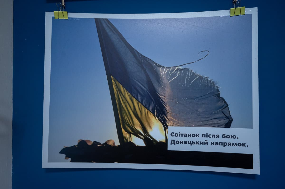 Тут для співбесід з кандидатами виділена простора кімната. На її стінах – плакати із закликами стати частиною легендарного «Азову», фото українського прапора у небі Донеччини, а також листівки від дітей.
