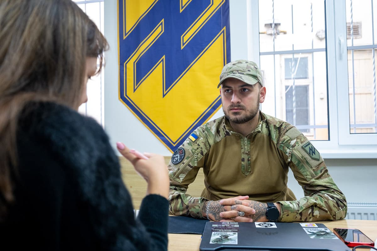 Із добровольцями зазвичай розмовляє боєць «Азову» Кшиштоф Мушак, який став головним рекрутером підрозділу у Львові.