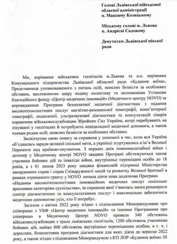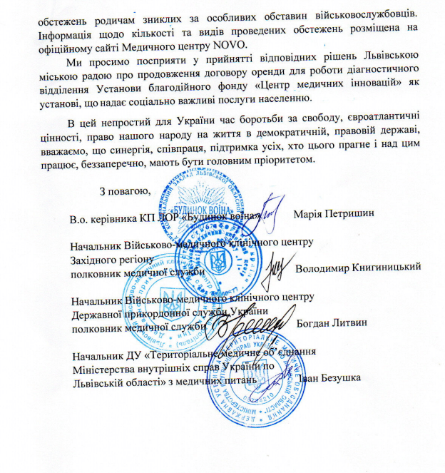 Лист керівників військових госпіталів Львова та в.о. керівника «Будинок воїна» з проханням посприяти у продовженні договору оренди медцентру NOVO