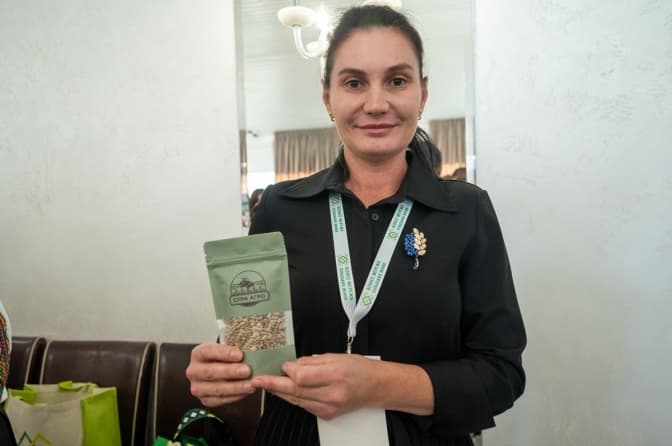 «Ми – сільгоспвиробники з Дніпропетровської області. Вирощуємо соняшник та пшеницю. Зараз хочемо запустити переробку насіння для виробництва олії. Щойно на початковому етапі. Бізнес-мережа підтримала нас олійним пресом. Виготовлятимемо сиродавлену олію. Тільки завдяки цій мережі ми почали це виробництво. Вона допомогла нам розробити логотип і підтримуватиме на подальших етапах», – каже Аліна Скрипник.
