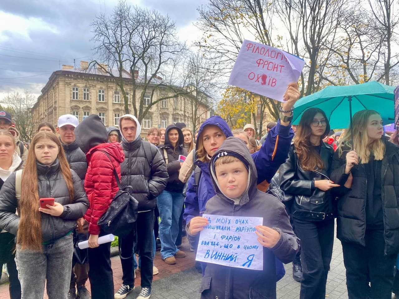 «Неодноразово від Ірини Фаріон були образи в бік мого міста Маріуполя. Я прийшла сюди зі своїм сином. В нього на плакаті написано, що він «причина російської агресії» в Україні. І якщо спочатку я сприймала Фаріон як фрика, як людину, яка несповна розуму, то заяви в бік військових мене просто вбили. Я маю чимало російськомовних друзів, які віддали життя за Україну і, зокрема, за Маріуполь. Це не просто зневага, це плювок в обличчя всім їм. Її теза про те, що війна всередині країни важливіша, аніж на “нулі”, також образлива для тих, що зараз боронять наші кордони. Ми маємо розуміти, що вона може таке писати лише тому, що тисячі військових зараз воюють. Бути тут – це громадський обов’язок мене і дитини. Я бачу, що тут зібралися не лише студенти, а й багато львів’ян і переселенців. Так зневажати військових неприпустимо під час війни».
