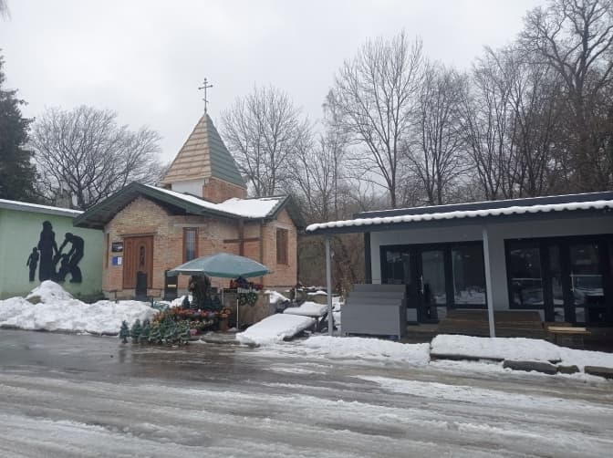Невелика цегляна церква недобудована, двері замкнені, нікого нема – ні священника, ні людей. Зі слів пані Надії, яка продає лампадки неподалік, ця церква завжди замкнена: