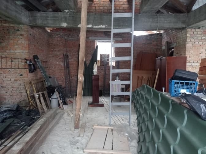 Проте до церковці ми все-таки потрапили. В пані Надії, як виявилося, були ключі, і вона погодилася впустити у приміщення. Тут усе на стадії ремонту: під ногами пісок, біля стін драбина і будівельні інструменти, черепиця. Поблизу заднього вікна стоїть невеликий стіл і стілець, ближче до середини – фігура Матері Божої. Тому справді постає питання: чи відбуваються тут літургії взагалі, чи правитимуть тут на Різдво?