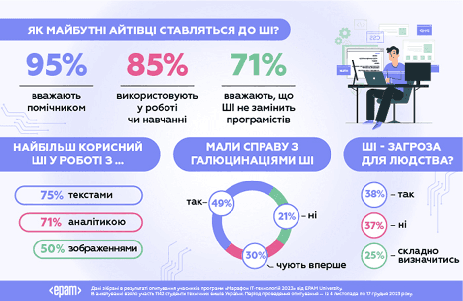Цікаво, що майбутні розробники також не бачать у ШІ свого конкурента. Відповідно до опитування, проведеного серед більш ніж тисячі студентів «Марафону ІТ-технологій 2023» від EPAM, 70% респондентів упевнені, що розумні алгоритми не зможуть замінити їх у майбутньому, позбавити роботи.