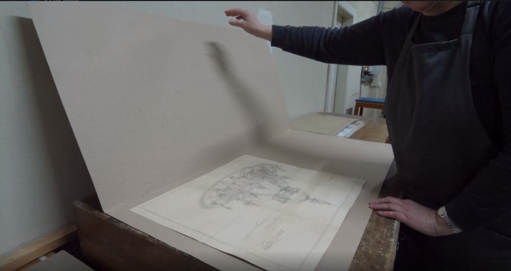 Завідувачка сектору фізичного зберігання документів Галина Мельник спочатку сама очищає гумкою всі ескізи від пилу та забруднень, потім обережно миє, але так, щоб не зачепити туш.