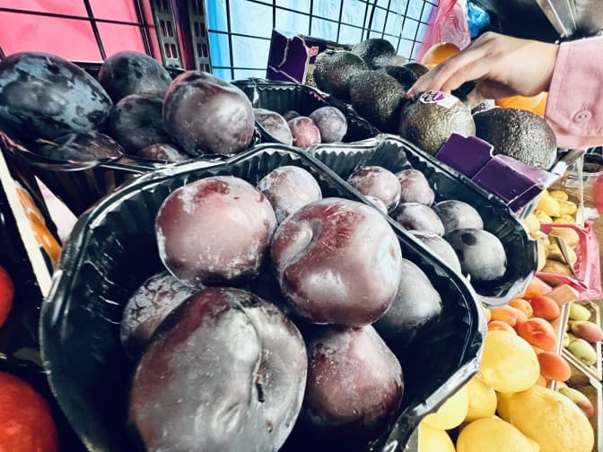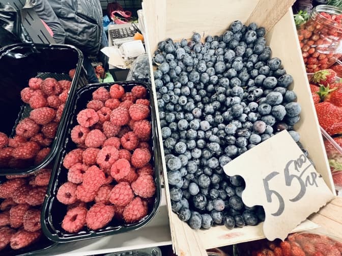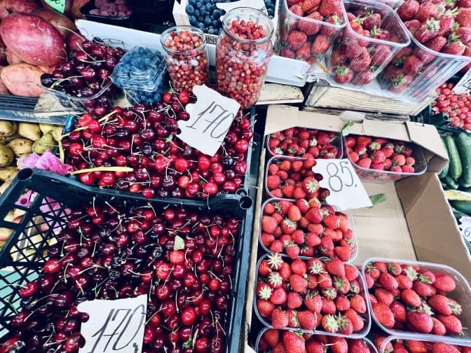 Великі чернівецькі черешні тут по 200 гривень, менші, в ящику, по 100. Полуниці по 100 гривень, банани з Південної Африки по 80 гривень. Персики по 150 гривень, нектарини з Іспанії, апельсини з Єгипту та Іспанії. Чорниці продають по 150 гривень за кілограм.