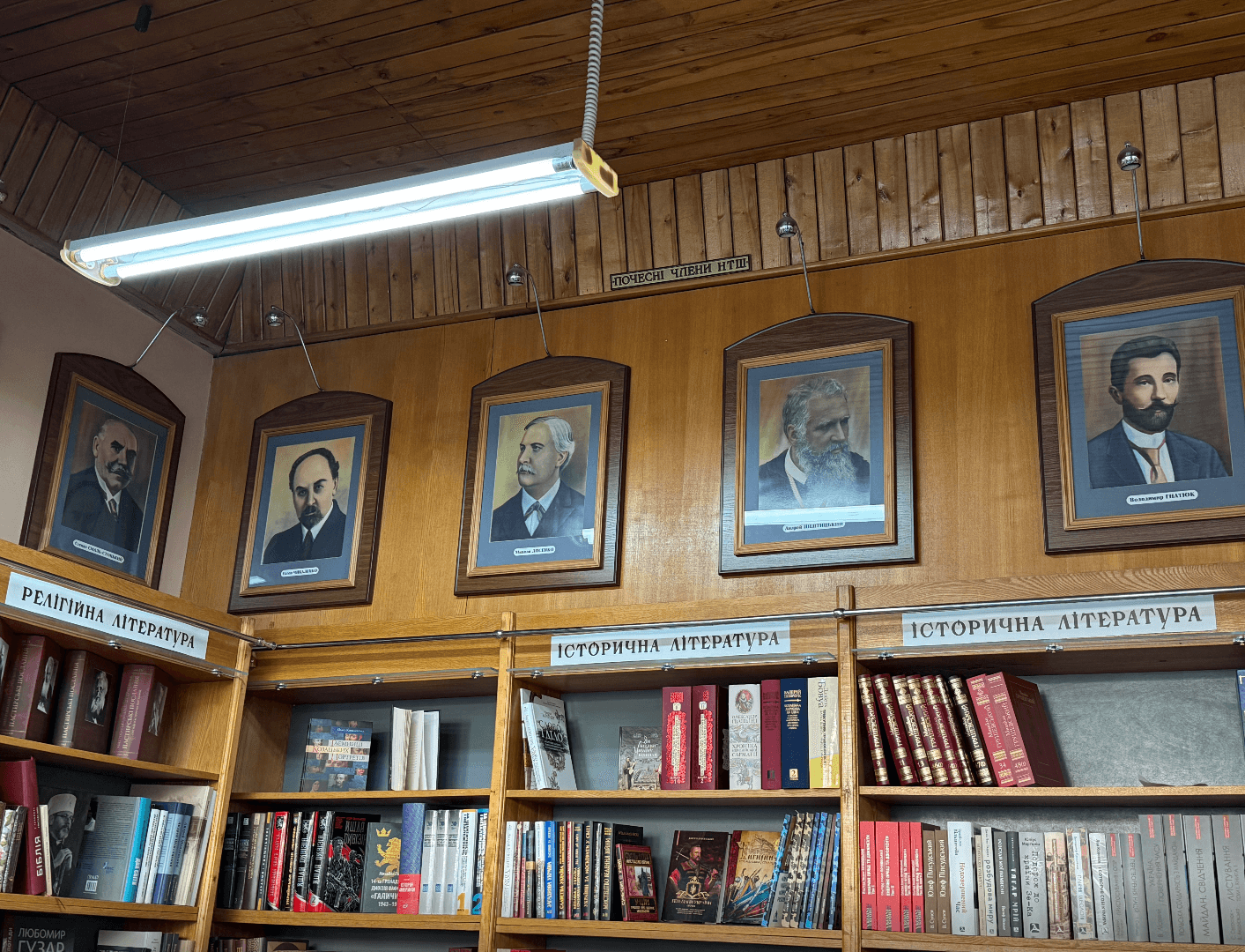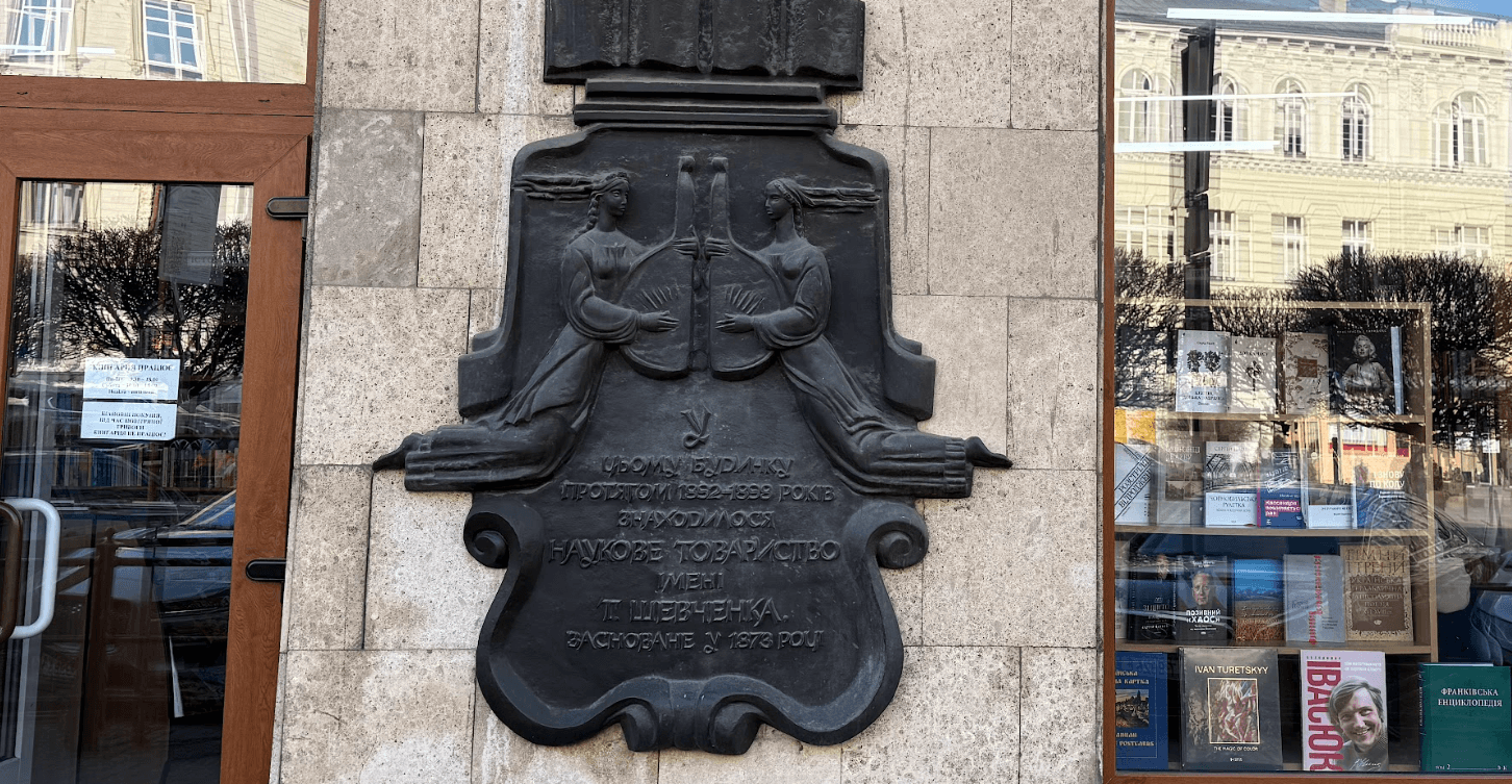 Будинок з понад 130-літньою історією зустрічає нас меморіальною дошкою з написом: «У цьому будинку протягом 1892–1898 років знаходилося Наукове товариство імені Т. Шевченка, засноване у 1873 році». Всередині книгарні бачимо портрети почесних членів НТШ і численні стелажі художньої літератури, зокрема й дитячої.