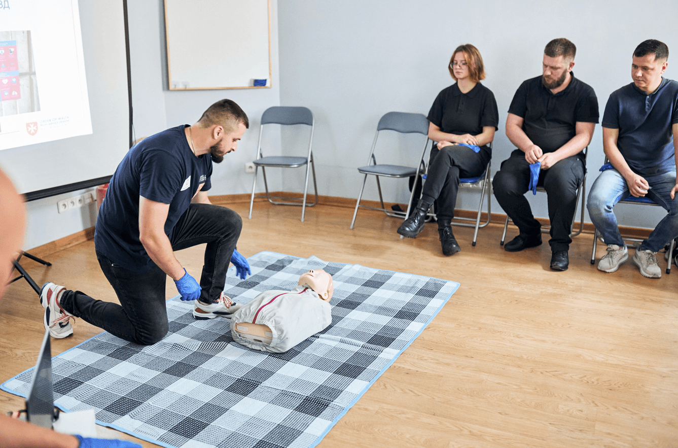 Наша програма навчання базується на вимогах Європейської ради реанімації та законодавстві України. Це означає, що ми даємо структуровані знання, але адаптуємо їх до реалій нашої країни. Наприклад, у сільській місцевості, де дефібрилятор недоступний, приділяємо більше уваги базовим методам порятунку: накладанню турнікетів, прямому тиску на рану, боковому положенню. Часто саме ці знання стають вирішальними.