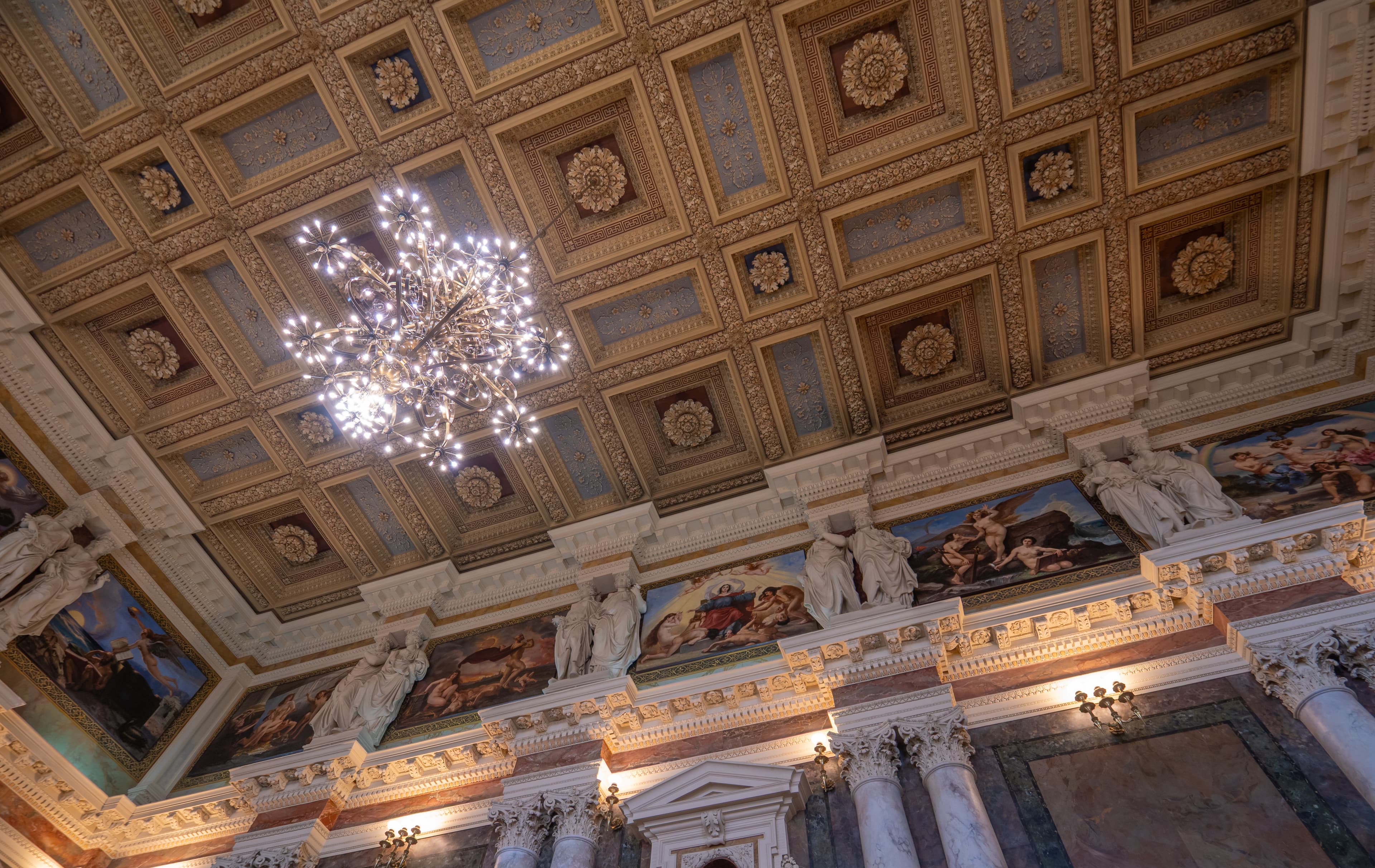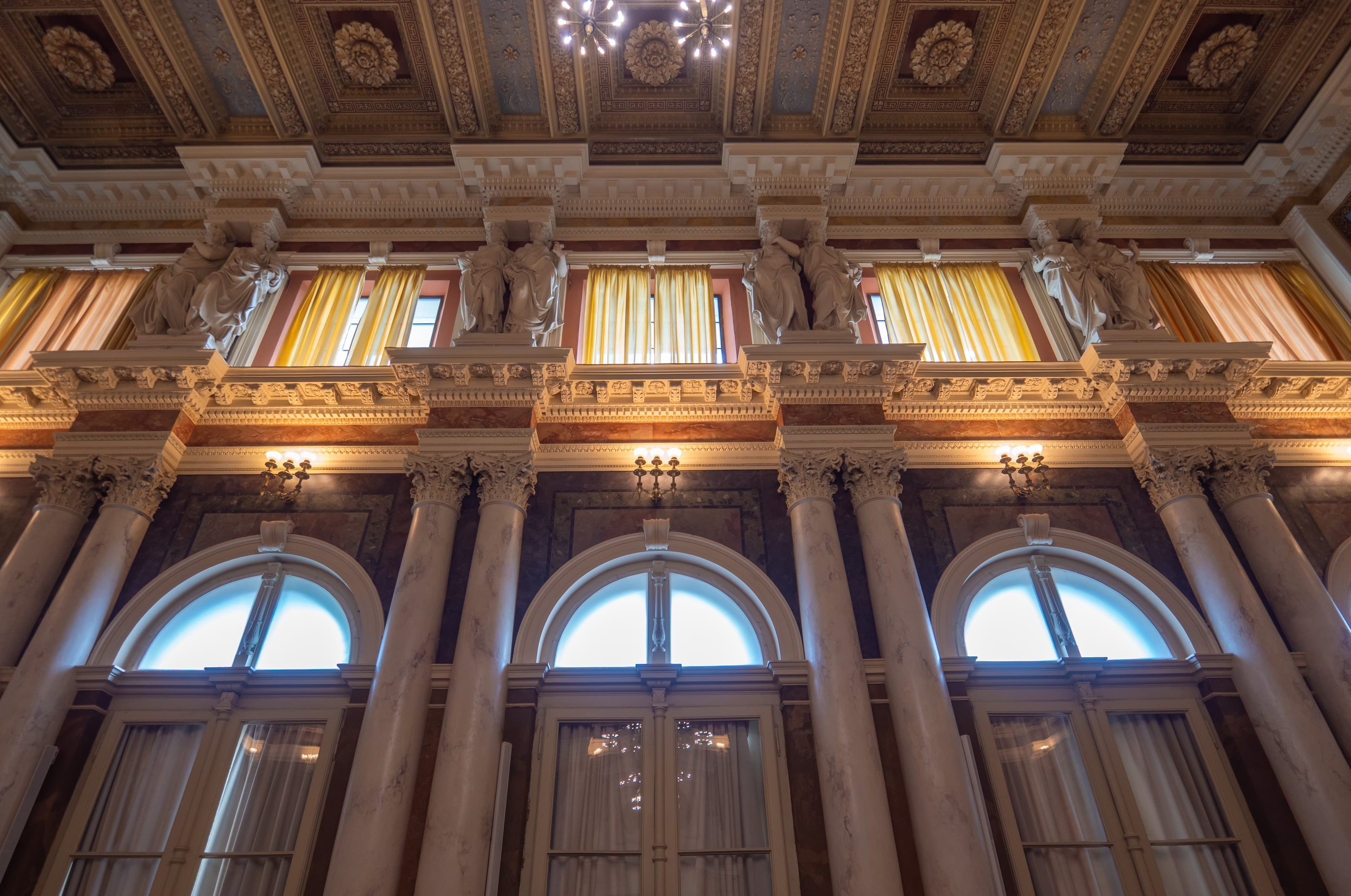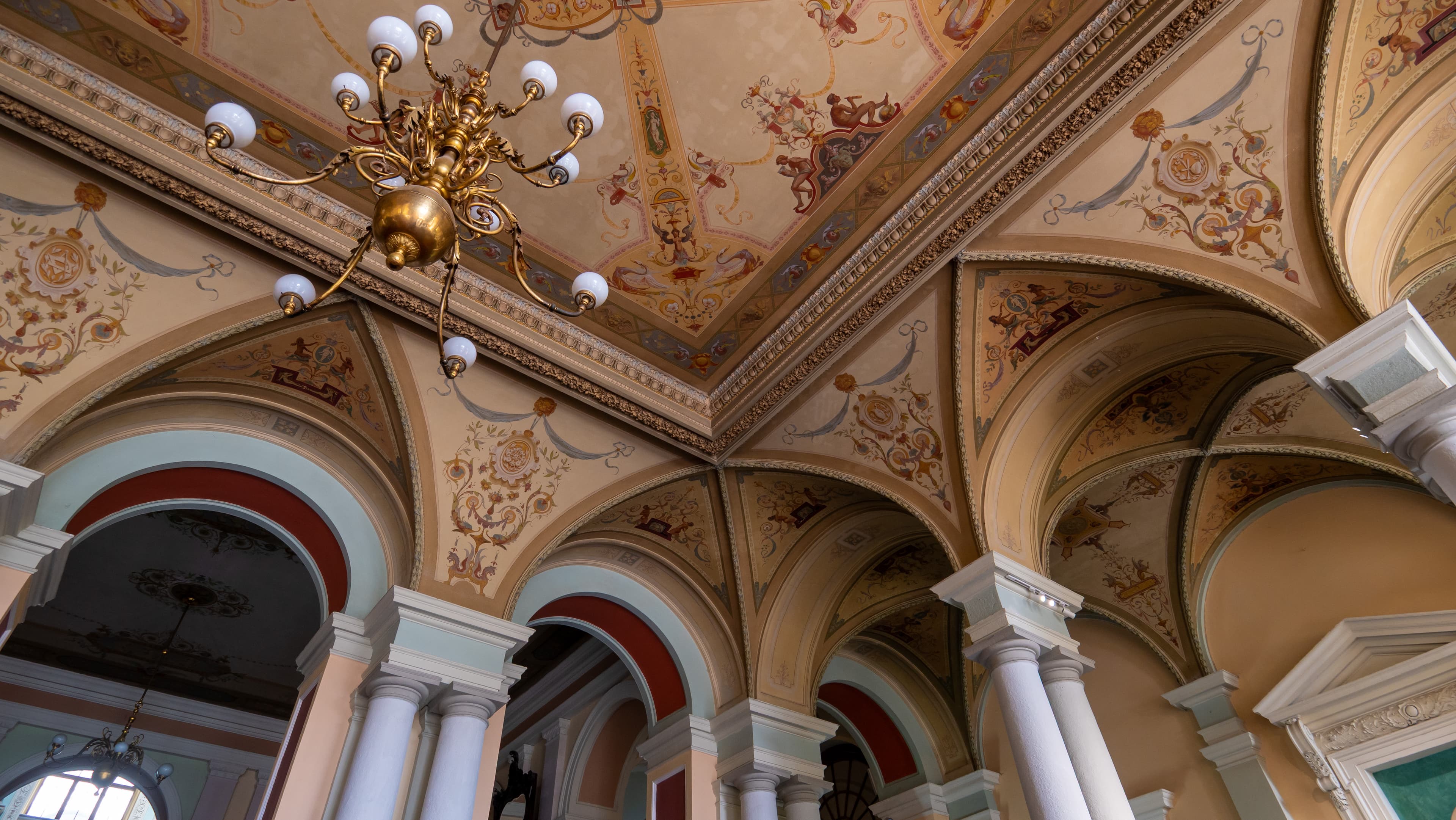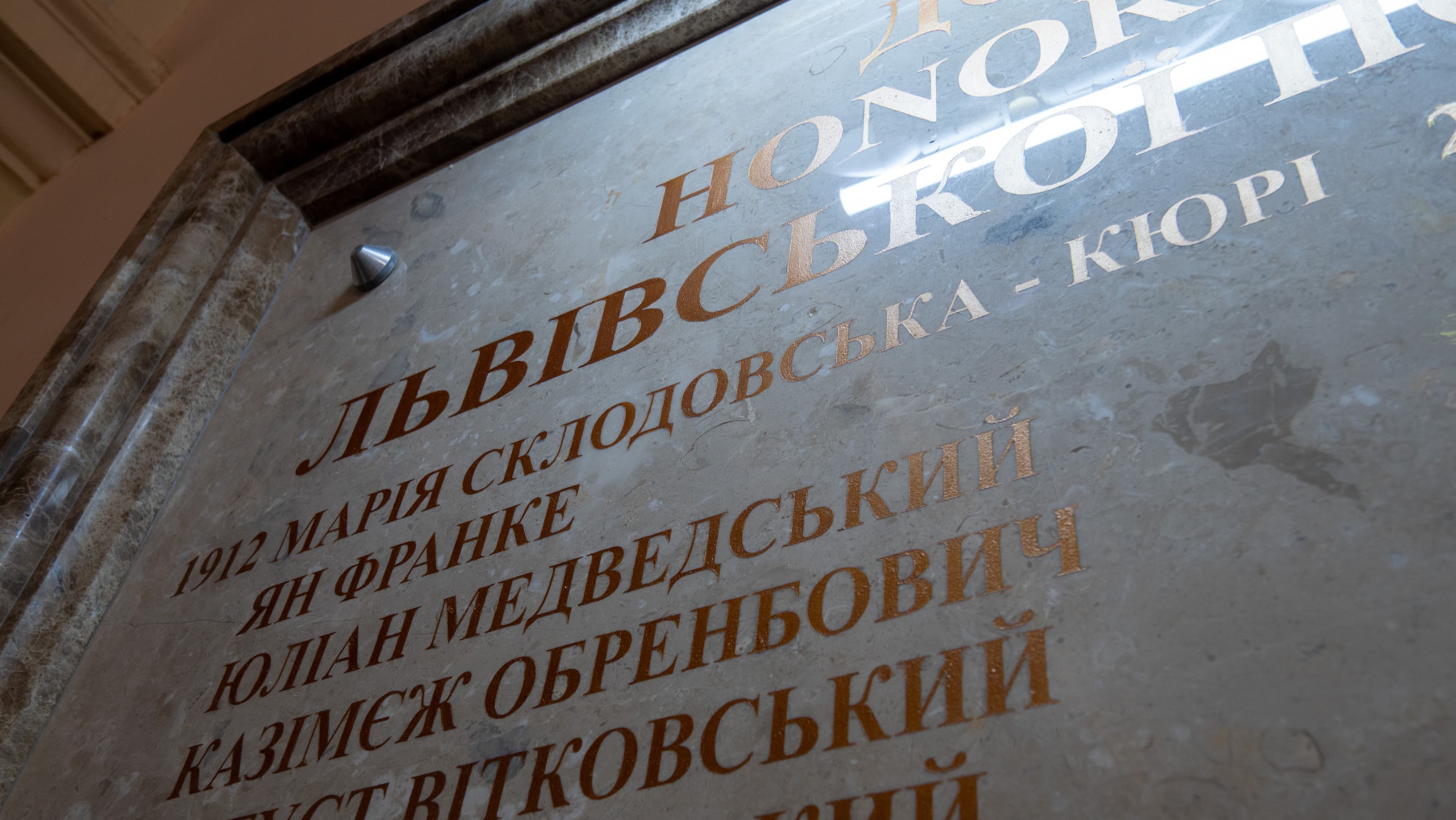 «На цій висоті, під самою стелею встановлено алегоричні скульптурні постаті – це Наука і Мистецтво. Про авторство науковці і досі сперечаються. Чия це робота? Еміля Шрьоделя чи Леонарда Марконі? Стеля вкрита майоліковими розетами, які виготовлені з випаленої кераміки, хоча виглядають вони, як дерев’яні, - розповідає Орест Лильо, провідний фахівець Центру промоції. – Покриття стін тут дуже схоже на мармур, проте насправді це розпис під мармур. Власне цей розпис і потребував реставрації, бо за радянських часів їх неодноразово перефарбовували. Реставраційні роботи тривали п’ять років і закінчилися у вересні 2020 року».
