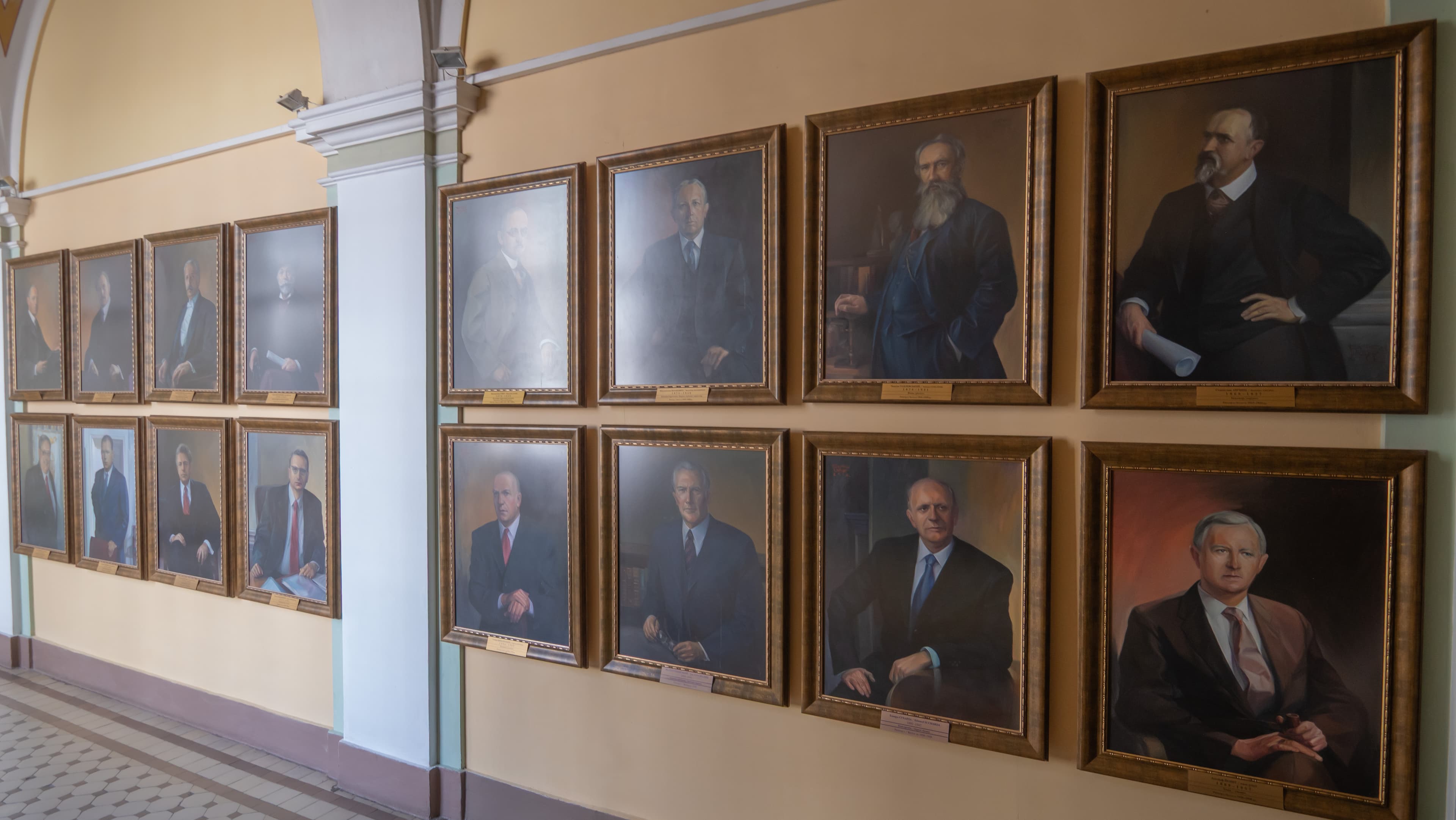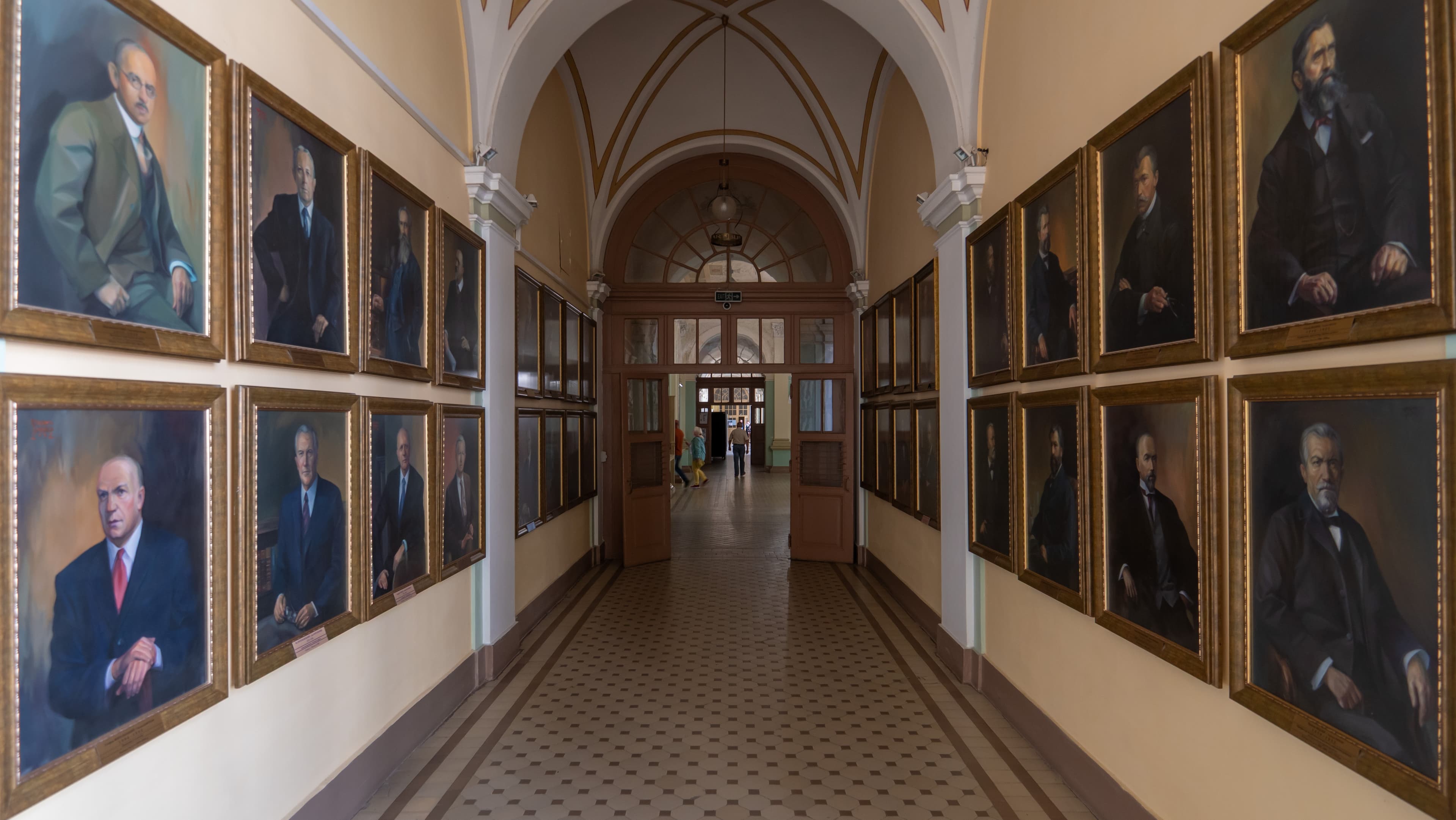 Галерея ректорів. Розташована на другому поверсі. Цікаво, що це не окреме приміщення, а частина коридору. Тобто портрети весь час на видноті, їх бачить кожен, хто проходить повз. І це – частина задуму. Портрети написані в одному академічному стилі, але зображення живі, передають характерні риси реальної людини.