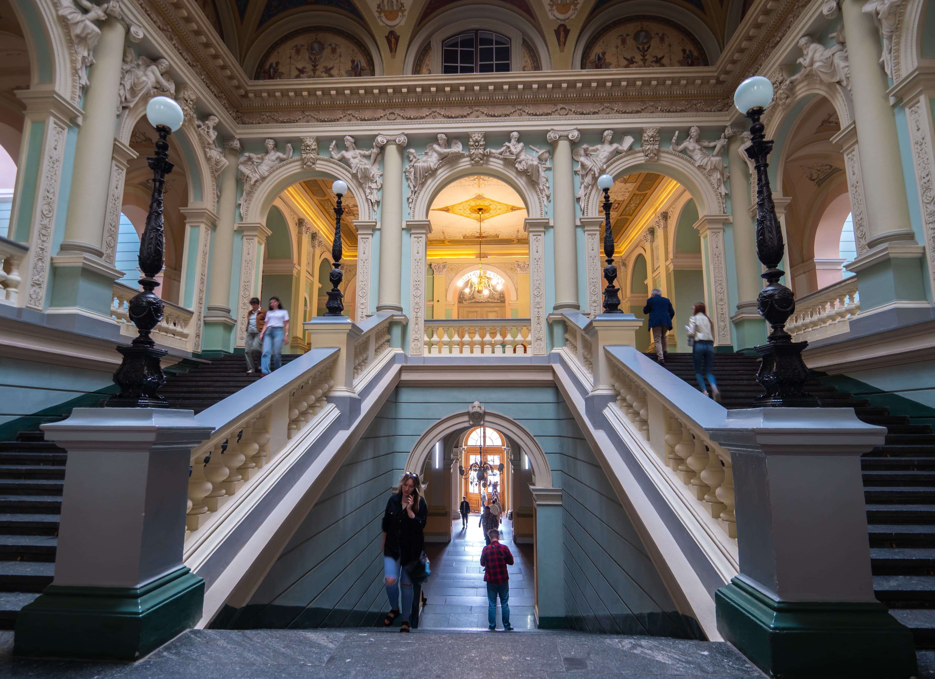 Парадний сходовий майданчик оздоблений аркадами, колонами, склепіння увінчує розпис, що зберігся до наших днів, аутентичні світильники-ліхтарі. Граціозні скульптури віденського майстра Еміля Шрьоделя. Тут панує атмосфера ХІХ століття з унікальними інтер’єрами, шедеврами малярства та скульптури.