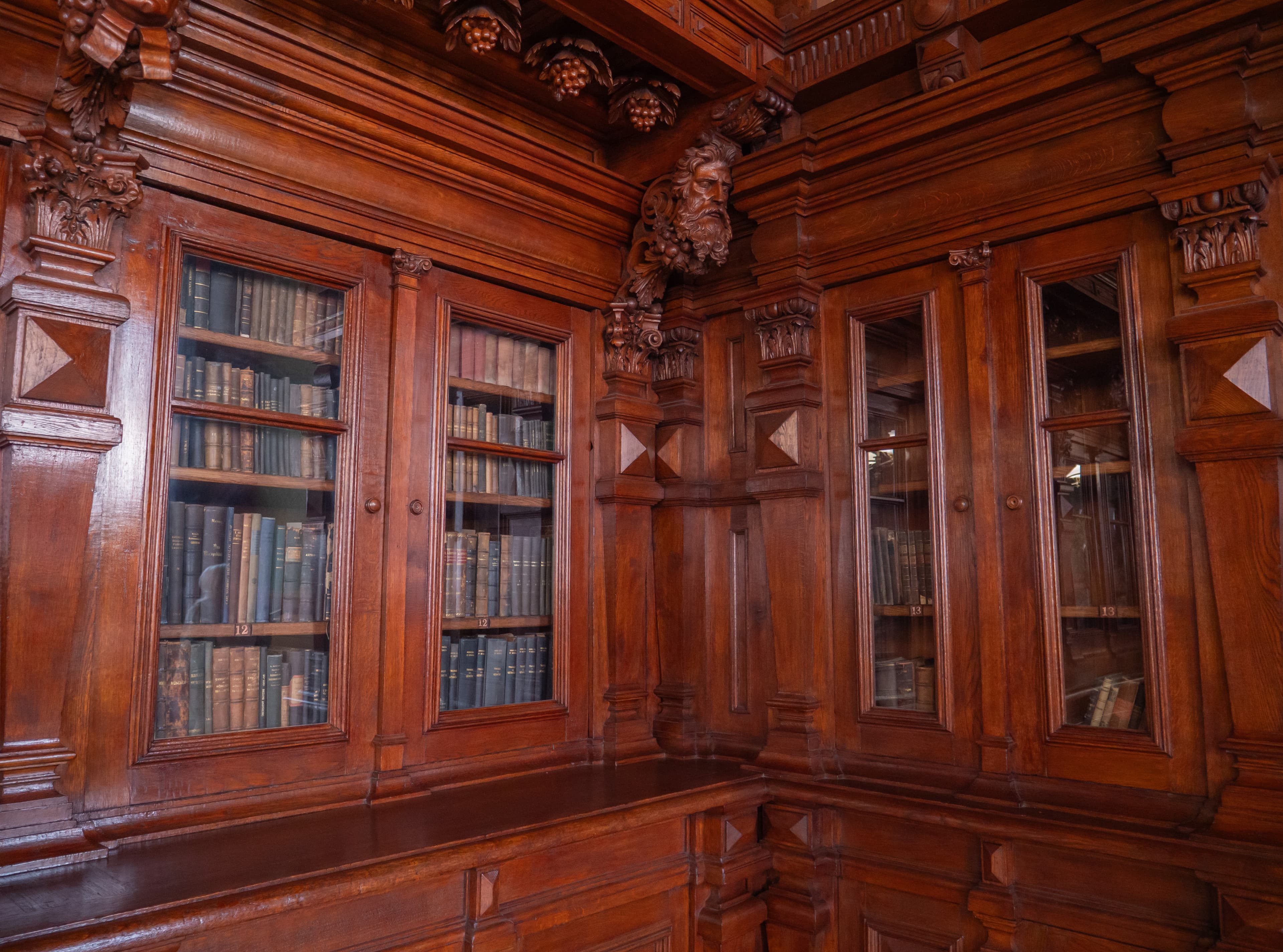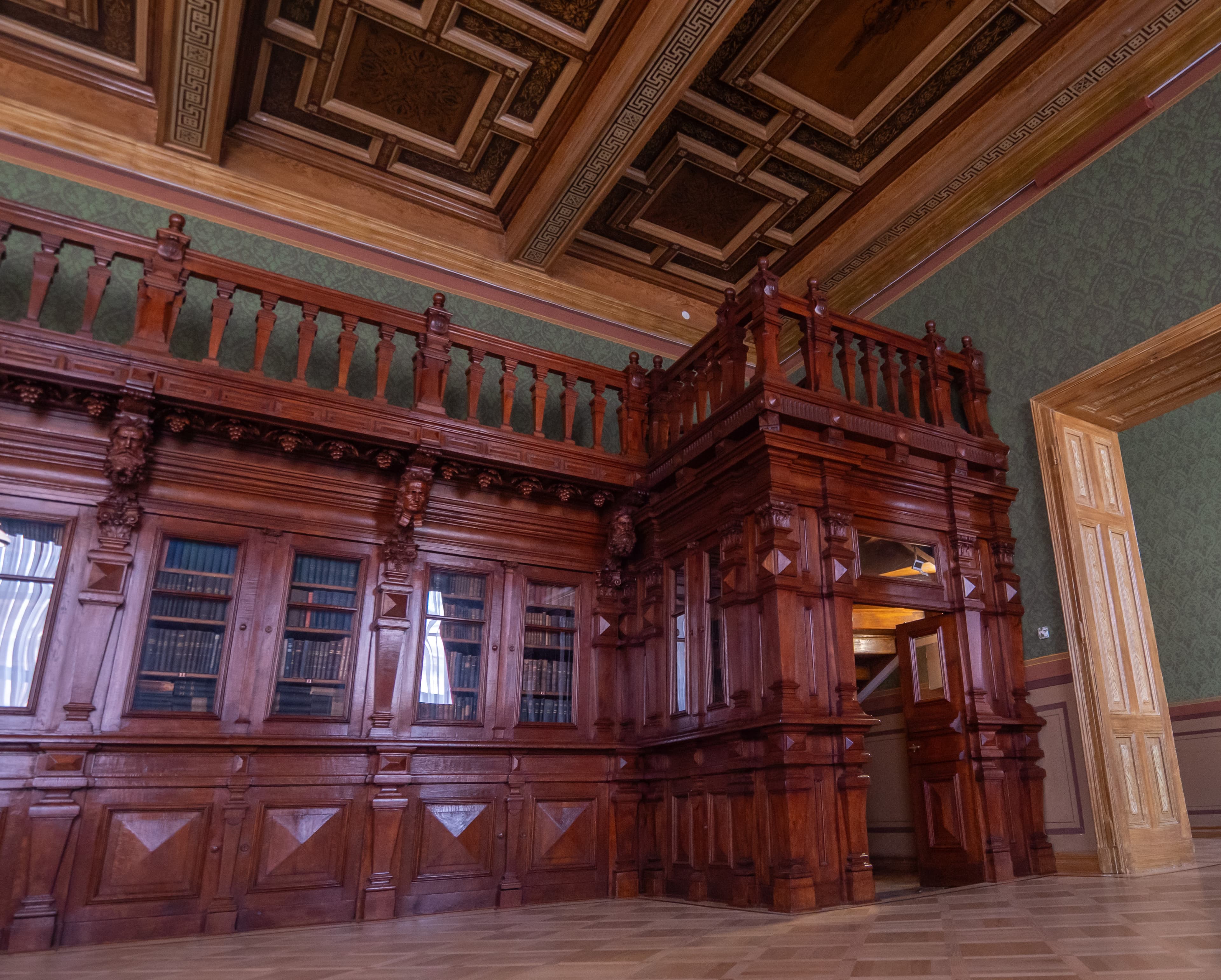 «Ця розкіш інтер’єру була призначена не для викладачів, а для звичайних студентів, - зазначає Андрій Павлишин. – Професорська читальна зала була за цими дверима. Але інтер’єри її не збереглися у первісному вигляді. Неоренесансну шафу запроєктовав Юліан Захарієвич разом з Леонардом Марконі. Шафа була двоярусною. На жаль, верхній ярус був втрачений. Найімовірніше, це сталося в період Другої Світовой війни або одразу після неї в радянські часи. Шафа унікальна. Її виготовили 1880 року на підприємстві братів Францішка та Юзефа Вчеляків у Львові. Майстерня відома зараз ще й тим, що її фахівці робили знамениті сходи у шляхетському казино, нинішньому Будинку вчених. Але шафа була створена на 20 років раніше, ніж сходи.
