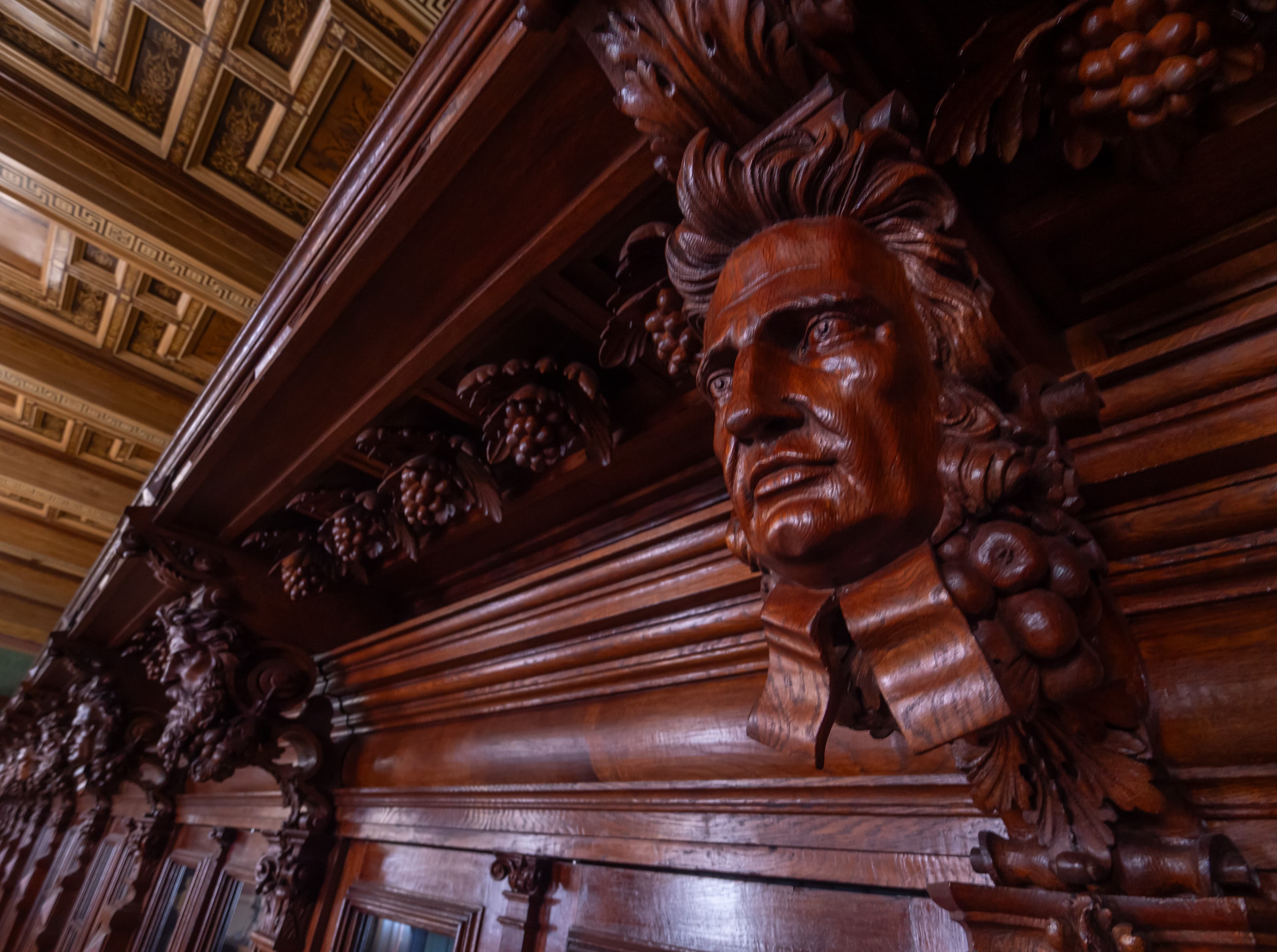 Шафа приховує таємницю маскаронів - дерев’яних скульптурних прикрас у формі голови людини, зображення яких повторюються по всій довжині шафи. Хто зображений на цих маскаронах? Загадкою є також знак, розташований над ними.