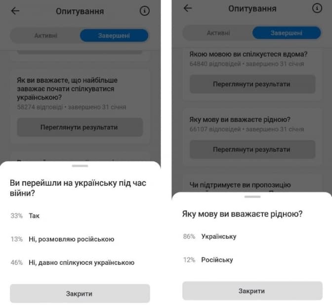 Але за новими опитуваннями відчувається і інша тенденція. У листопаді 2025 року хвилю обговорення в соціальних мережах спричинили результати опитування, проведеного навесні того року Державною службою якості освіти України спільно з Уповноваженим із захисту державної мови. Згідно з ними, 66% учнів київських шкіл спілкуються російською мовою на уроках, а 82% – на перервах.