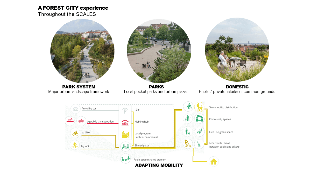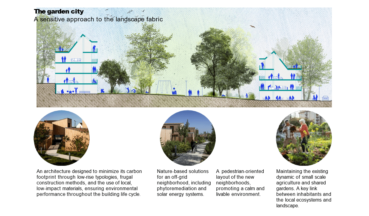 У Agence TER & Martin Duplantier найменший показник серед усіх команд – близько 10 000 нових мешканців. Це пояснюється тим, що значна частина території в їхньому майстер-плані відведена під відкриті парки, водойми, широкі «зелені коридори» та відновлення природного ландшафту.