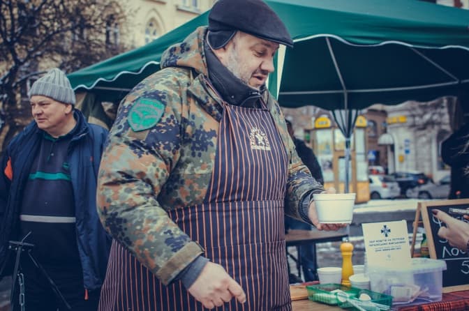 В тяжкі часи чоловіки вирішили не просто готувати, а ще й допомагати Армії. Цього разу вони пригощали львів’ян фінською зупою, якою 1940-му хоробрі снайпери країни Суомі грілися вичікуючи ординця з червоною зіркою в чолі.