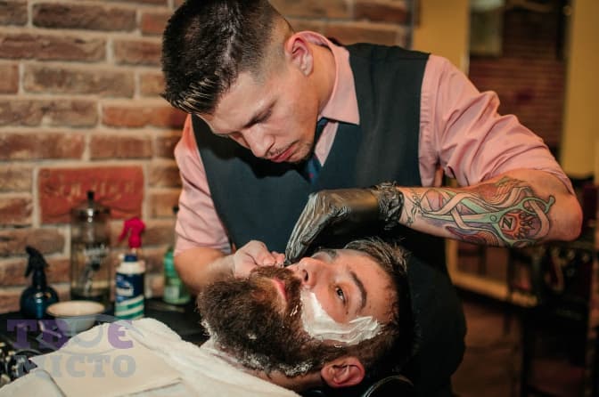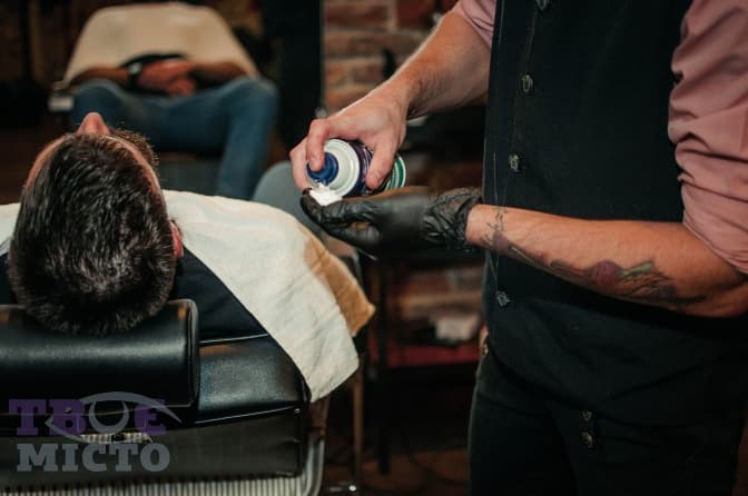 Далі барбер вдягає рукавичку та наносить піну з екстрактом алое. Перед бриттям обов’язково показує гостю лезо, бо не можна брити небезпечною бритвою. Тільки, якщо клієнт прийде зі своєю.