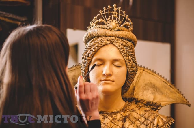 Дівчину фарбують театральним гримом. Він не псує шкіру і має таку ж структуру, як і тональний крем. Перевтілення триває півгодини.