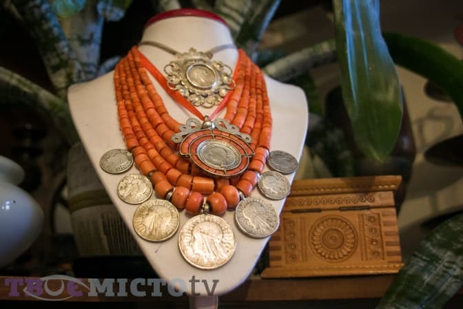 Я зараз не вишиваю, бо дуже багато займає часу. Почала займатися костюмами в традиційному стилі, коралями. З коралями взагалі була дуже цікава історія. Я коли була вагітна моїм синочком, Павлусиком, почала вишивати собі сорочку (сорочку вишивала по книжці Ксенії Колотило, тільки замінила трошки кольори). Чоловік замовив у Слави Салюк (дизайнерка прикрас - ред.) мені коралі. Він возив ту сорочку до неї, вони підбирали перламутр, срібні хрести–сварги, це був цілий процес. Ті коралі були даровані мені на День святого Миколая. Я була така щаслива отримати коралі від майстрині! Потім ці коралі побачила моя кума і каже: «Я хочу такі самі». Я кажу: «Давай я тобі дам телефон і ти собі замовиш». Вона відповідає: «Ні, я хочу від тебе». Я кажу: «Так я ж не вмію їх робити, я навіть не знаю, з чого почати». Так почалася нова історія. Ми їздити по магазинах, шукали фурнітуру, камінь. Зробила я ці коралі. Потім вирішила нанизати заново всі магазинні коралі, які були в хаті: десь додала якусь фурнітуру, десь хрестик. Потім комусь щось подарувала, а потім вирішила трохи продавати, і так воно пішло.