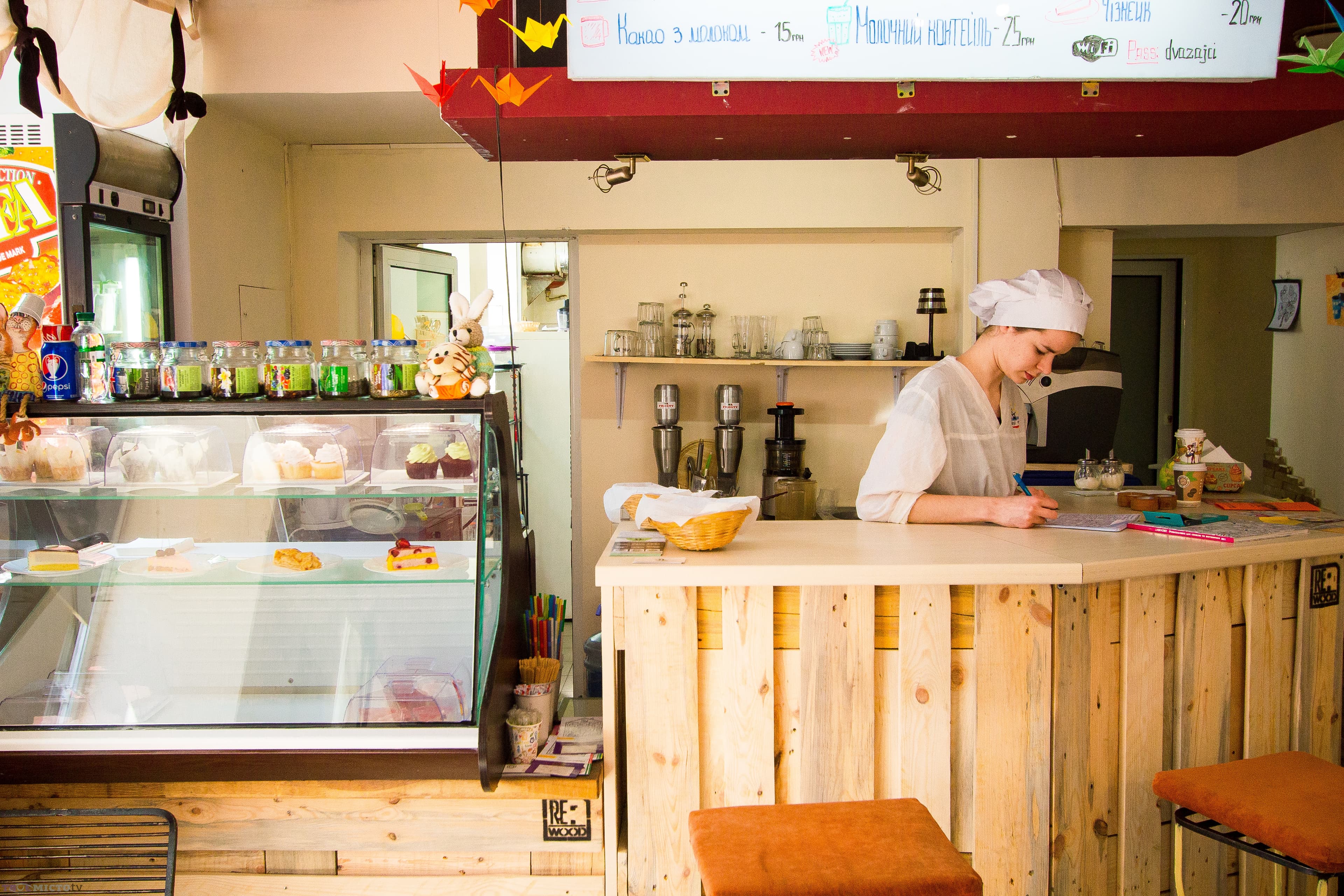 Ми перевіряємо і куштуємо шоколадний з м’ятою і ванільний з вишнями капкейки. Тістечко невелике, тримати його зручно, крем має приємний аромат і не розтікається. Він аж повітряний, але смак насичений і листочок м’яти освіжає солодкий шоколад, а вишня ж навпаки – контрастно підкреслює легкість ванільної основи. Чізкей, або як його називають у Львові – сирник, подають також із вишнями. І хоча сирник таки більше подібний на свого західного брата (галицький варіант печуть, сир має бути коров’ячий м’який, а не маскарпоне), але на смак – домашній. Поки ми наминаємо смаколики, Петро миє та ріже яблука на фреш, при нас його готує і подає з незмінною усмішкою.