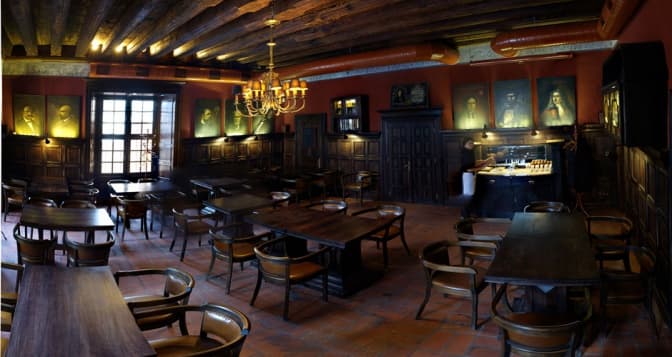 Заклад поділений на три зали. Перший демонструє відвідувачам унікальний вітраж видатного монументального живописця Яна Генріка Розена, що розписував у Львові Вірменський собор, костел Стрітення монастиря Кармеліток та ін. Другий – це знайомство з алкогольною історією Львова. Третій – свого роду галерея відомих відвідувачів закладу.