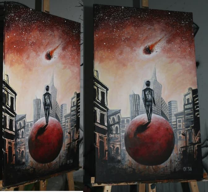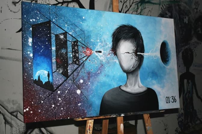 Називається вона «Альтернативна реальність». Ідея якось дуже випадково прийшла в голову. Все почалось з ескізу татуювання. Я спочатку задумала зробити щось типу коміксу на людях - кожен з клієнтів мав би мати на собі якусь частинку історії з одним персонажем, який присутній на кожній картинці. Він мав бути в різних ситуаціях і в різних реальностях, тому і назвала «альтернативна реальність». Спершу думала зробити десь робіт із 5, але потім персонаж мені сподобався, і я захотіла збільшити масштаби та перенести ідеї на полотна, збільшити кількість картин.