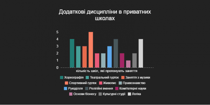 Найчастіше учням приватних шкіл пропонують заняття з шахів та спортивні гуртки. Рідше трапляються актуальні дисципліни, яких поки що немає в державній програмі – наприклад, основи підприємництва, програмування тощо. Комп’ютерні науки викладають лише в Християнській школі «Перлина» та в нещодавно відкритій Міжнародній креативній школі (КМДШ). Основам підприємництва навчають в школі «Перспектива». Культурні студії мають змогу відвідувати учні школи «Ерудит» та школи-гімназії «Шанс». Кращою ситуація є з навчанням дітей логіки та критичному мисленню: аж чотири львівські приватні школи пропонують додаткові заняття з цих дисциплін. Це вже згадані вище «Шанс» та «Перлина», а також приватна школа «Святої Софії» і Львівська українська приватна гімназія.
