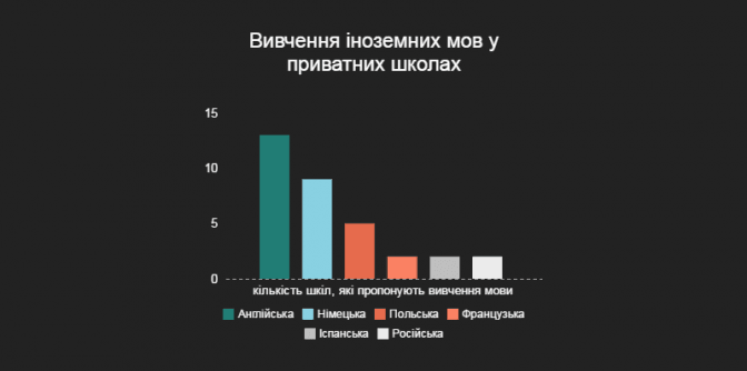Крім обов’язкової англійської, майже всі приватні школи Львова пропонують вивчення другої іноземної. Найчастіше – німецької. П’ять шкіл пропонують вивчення більш ніж двох мов.