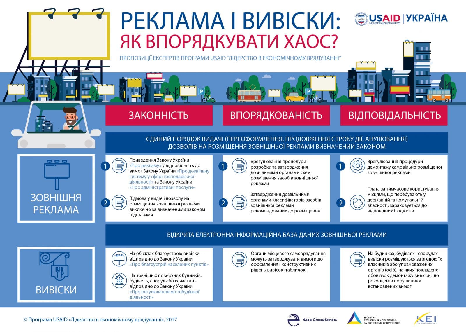 Нещодавно експерти програми «Лідерство в економічному врядуванні» американського агентства з міжнародного розвитку (USAID) сформулювали пропозиції щодо вдосконалення регулювання у сфері зовнішньої реклами. Вони дійшли висновку, що саме незбалансованість системи і нечіткість процедур призводять до зловживання зі сторони влади. Намагаючись оминути бюрократичні бар’єри, підприємці самовільно й хаотично розміщують рекламу, не дотримуючись правил.