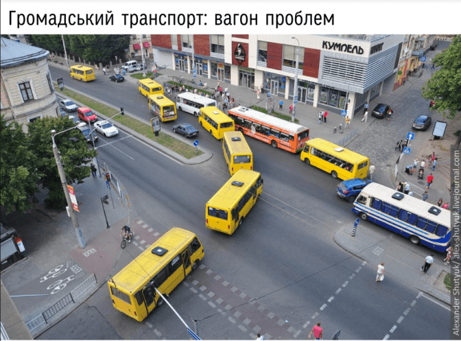 Третя проблема – це маршрутки, тобто взагалі їхня наявність у Львові. Це – транспорт відсталих країн, завдання якого перевезти якомога більше пасажирів і цим заробити гроші. Тобто маршрутчики заробляють безпосередньо на їзді та частій зміні пасажирів кожні 4-5 зупинок. Так це працює, наприклад, в Індії, Пакистані, Болівії, Танзанії, Колумбії і Україні. Латвія, Литва, Угорщина і навіть Білорусь мають значно кращу ситуацію. Вони не зробили тієї помилки, яку зробили ми. Вони не віддали громадський транспорт у приватні руки. Чому в Польщі транспорт кращий, аніж у нас? Багато хто відповість: «Бо там висока вартість проїзду». Але ж вони не знають, якою там є собівартість перевезень. Там звичайний разовий квиток коштує 3,80 злотих (2,20 злотих за умови довготривалого проїзного), а собівартість перевезення однієї людини на кілометр – 7,26 злотого. У Кракові транспорт на 40% дофінансовується з міського бюджету. Так є в усьому світі: хороший транспорт – збитковий і дотаційний, маршрутка – прибуткова і розвалена.