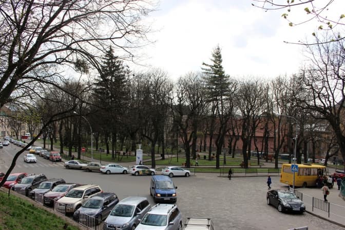 Вид зі скверу на Вежу Корнякта