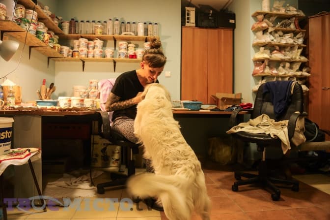 До майстерні можна зайти лише з дозволу Діамена – Мартиного білого пса. Він радісно кидається на кожного, хто з’являється на порозі, збиває з ніг, лізе цілуватись. Заспокоюється, лише коли його займають великою червоною рукавицею.