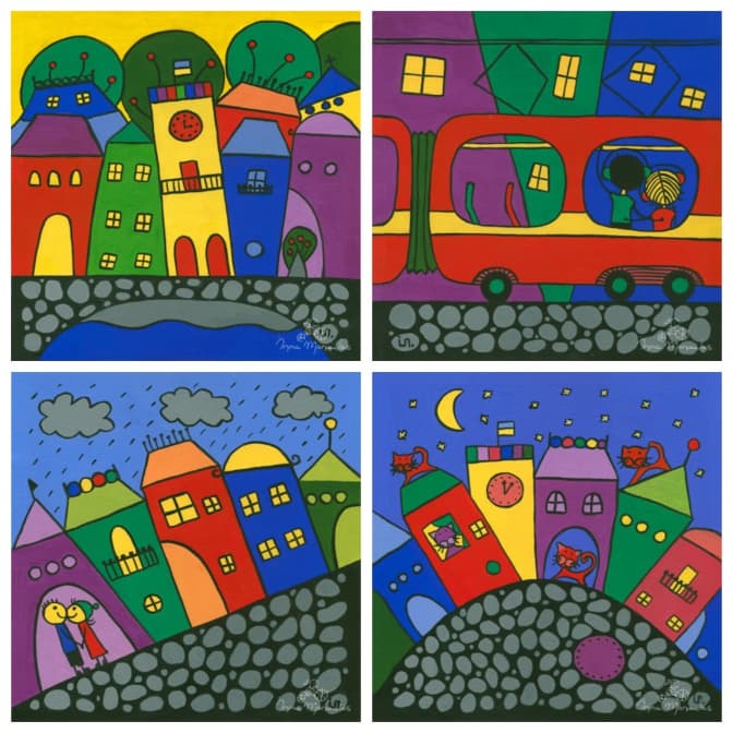 Перший набір листівок – моя фантазія про Львів. Там є котики, яких справді багато у Львові, особливо на Вірменській. Другий набір – моє дорослішання. Я ходила, спостерігала за ракурсами, архітектурою. Врешті вийшов набір із закоханими в різних локаціях міста. Думаю над третім набором, але зараз частіше виникають сюжети картин. Останні два роки присвятила тільки книжці «Магда і вітер».