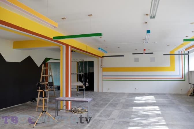У холі просторої школи №83 на вулиці Пулюя триває ремонт: облаштовують робочу зону з кольоровими стінами та яскравим дизайном для проведення інтегрованих уроків.