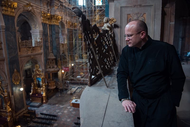 Храм святих апостолів Петра і Павла – в народі «Костел єзуїтів» – повернули Українській греко-католицькій церкві шість років тому. Ця церква початку сімнадцятого століття була львівським гарнізонним храмом сто років – аж до завершення Другої світової війни. За радянської влади тут було книгосховище бібліотеки імені Стефаника. «За три місяці вивезли сто сорок чотири машини книг і тридцять машин стелажів», – пригадує настоятель храму отець Степан Сус. Він очолював центр військового капеланства Львівської Архиєпархії УГКЦ, тож для нього було важливо, аби військові та їхні родини брали участь у богослужіннях. Утім, сьогодні цей храм відкритий для всіх – військових і цивільних, львів’ян і захоплених унікальною архітектурою гостей міста. Після початку Революції гідності гарнізонний храм став місцем, де збирали допомогу майданівцям, а згодом – захисникам України, що воюють на Донбасі. Священик, капелан і волонтер отець Степан Сус розповів, як гарнізонний храм став церквою, відкритою для всіх.