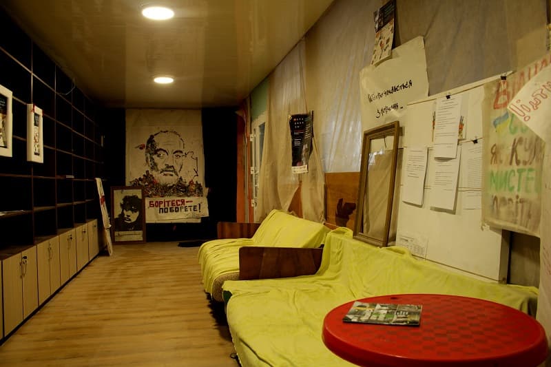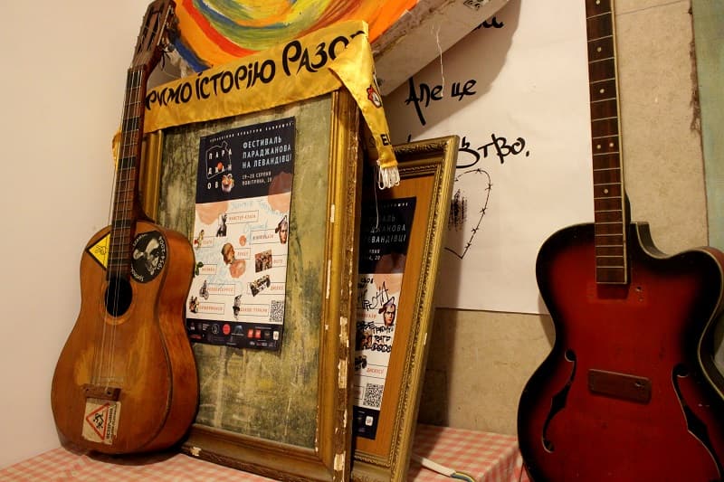 При вході стоїть крихітний диван, навпроти висять афіші: Міжнародний фестиваль Параджанова на Левандівці, фестиваль JazzBez, кінопокази, лекції та концерти. Це лише маленька частина того, що встигло відбутися після того, як левандівці зайшли всередину.