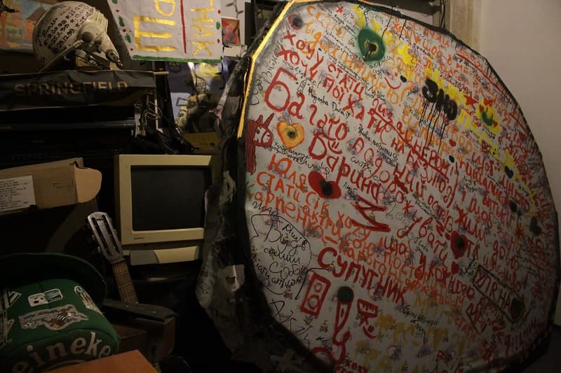 На першому поверсі є кімната зі скарбами, які залишилися після акцій «Квиток на неперший сеанс», фестивалю Параджанова та мистецьких резиденцій. Торік сюди приїжджали з десяток митців із Грузії, Польщі, України та Білорусі. Перформанси, мистецькі акції, виставки та мурали на стінах – це їхня робота. Польський митець зробив бубон діаметром у два метри. Бубон ледь поміщається в кімнату. На ньому різними кольорами написані бажання: хочу поїхати на море, багато подорожувати, стати відмінницею. Працює це так: треба бути великою барабанною палицею в бубон і загадувати бажання. Бажано якнайгучніше. Олександр вибиває на бубоні кілька тактів.