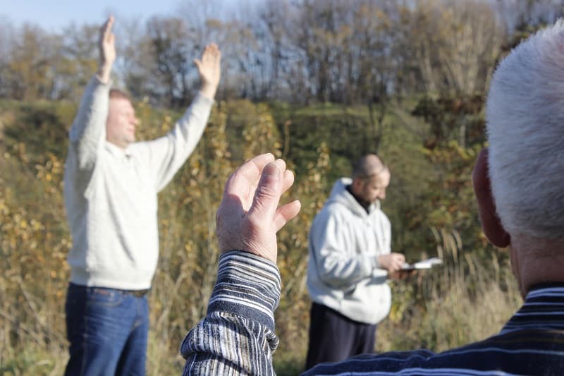 – Розходьтеся по колу! – каже Василь. Він має все готове до ритуалу: на вишиваному рушнику лежить хліб, книга-молитовник, кухоль у формі рогу та трав’яна настоянка у пляшці. Чоловіки й жінки, урвавши розмови, стають до обряду.