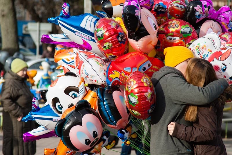 Поблизу них обіймається парочка, ховаючись від усього світу у гроні повітряних кульок.