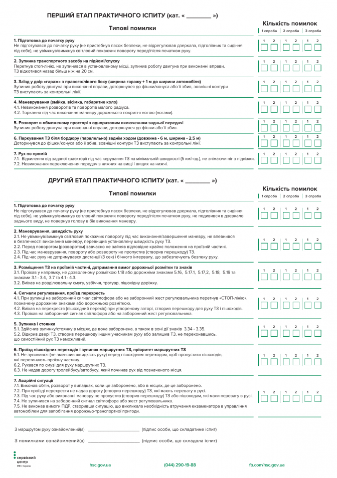 Можна також завантажити чек-лист, яким будуть користуватися екзаменатори під час практичної частини іспиту. В ньому зазначені перелік вправ та типові помилки, котрих припускаються громадяни під час практичного іспиту, та шкала оцінювання. Це спростить процес підготовки до іспиту.