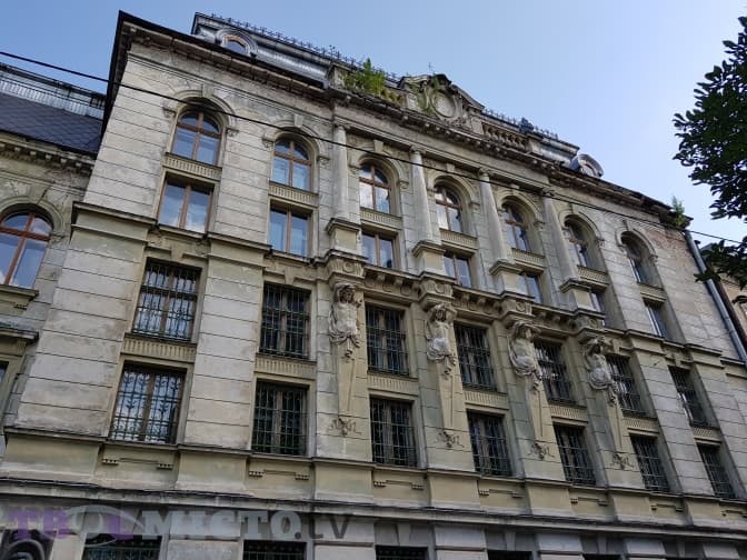 У сусідній раціоналістично-сецесійній великій кам’яниці, збудованій у 1911 році, балкон тримають скульптури Зігмунта Курчинського.