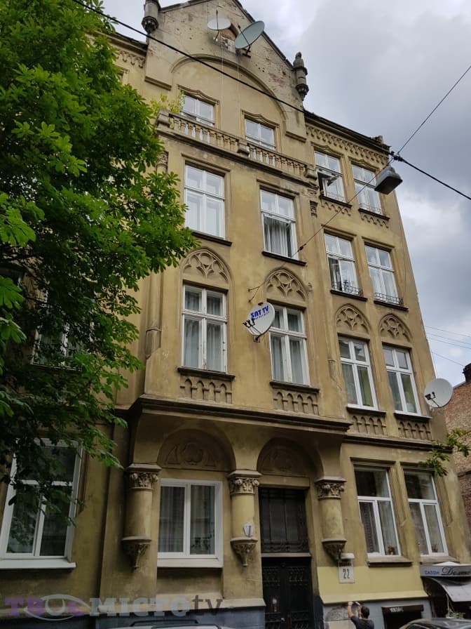 Навпроти бібліотеки розташована житлова кам’яниця №22 з характерними колонами, які зустрічалися у її «сестри-близнючки» на вулиці Сніжній, 5.