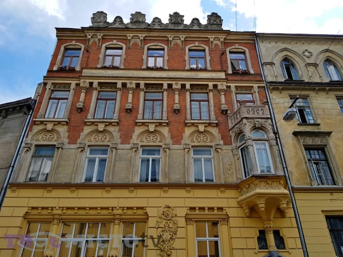 Навпроти входу до академії танцю привертає увагу сірий будинок із незвичним скульптурним оздобленням. Збудували його 1924 року для дирекції Ходорівського цукрового заводу за проектом Євгена Червінського та Альфреда Захаревича.