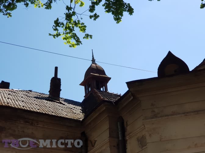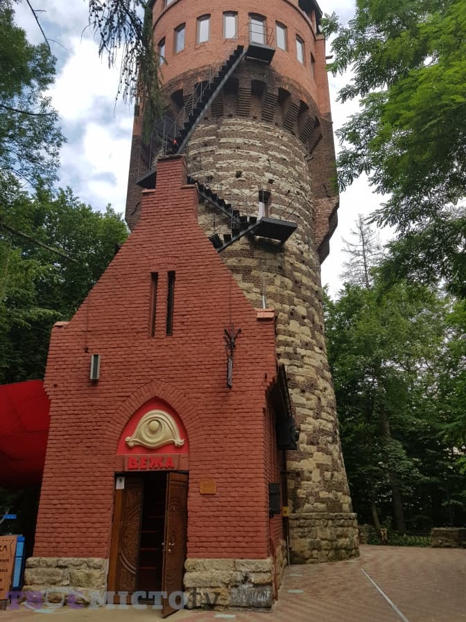 …і далі непомітною стежкою піднімаємося вгору до парку, звідки можна по-справжньому помилуватися красою вежі вілли Івана Долинського та її цікавими елементами, зокрема, дощовим водометом – горгульєю.