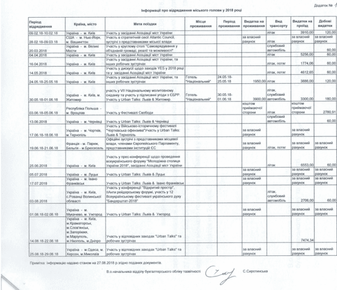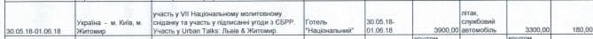 Однак, судячи з поданої інформації, на Urban Talks в Чернівцях він їздив службовою автівкою, але чи були витрачені на це бюджетні кошти – не значено. Так само не до кінця зрозуміло, скільки грошей він витратив на поїздку у Житомир. Це відрядження співпало із службовою поїздкою в Київ на участь у Національному молитовному сніданку. Там він жив у готелі «Національний», на що витрачено 3900 гривень за дві ночі, а дістався до Києва літаком за 3300 грн. Це бюджетні кошти. У цій же графі зазначено, що він використовував службове авто, однак не зрозуміло, в яких цілях і куди їздив.